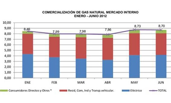 Según el documento de la estatal petrolera, a lo largo de la gestión 2012, el Sector Eléctrico muestra el mayor consumo de gas natural dentro del mercado interno con un volumen promedio de 3,86 MMmcd y representa el 46.58% del consumo total  de  gas  natural.