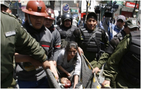 El viceministro de Régimen Interior y Policía, Jorge Pérez, confirmó que la protesta de los cooperativistas mineros arrojó este martes al menos siete heridos: Héctor Choque, Wilson Miranda, Juan Torrez, José Gómez, Isaac Quispe, Hilario Choque y el peatón Simón Contreras.