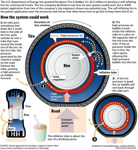 Sin sistemas electrónicos o mecánicos externos complicados, ni haciéndolas mucho más caras, Goodyear ha desarrollado un nuevo tipo de ruedas que permitirá que mientras viajas ellas solas se autorregulen e inflen con el aire externo,utilizando un sistema de válvulas y un tubo interno situado dentro de la propia rueda.