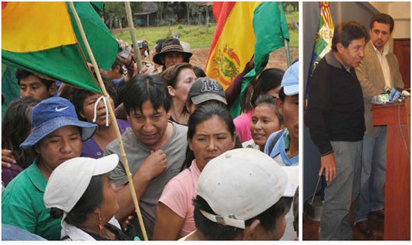 El sábado 24 de septiembre del año 2011, el canciller David Choquehuanca llegaba a San Miguel de Chaparina, en un nuevo intento del Gobierno para entablar el diálogo con los comunarios que participaban de la octava marcha indígena. Sin embargo, la tensión aumentó en el lugar cuando la autoridad negó a los indígenas que existía un bloqueo en Yucumo, lo que provocó que las mujeres marchistas obligaran a caminar al Canciller hasta el punto de bloqueo para corroborar lo contrario. Mujeres indígenas escoltando a Choquehuanca rumbo a Yucumo. Más tarde, la autoridad relataba que la situación era difícil en el lugar y que “algo se debía hacer”.