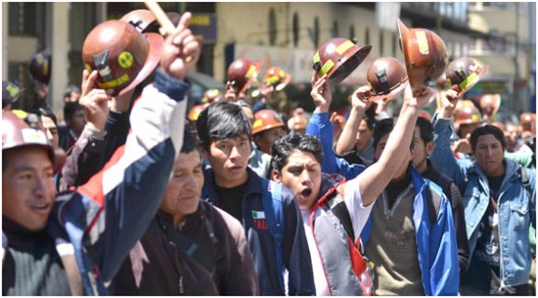 Mineros cooperativistas marchan en el centro de la ciudad de La Paz, ayer.Los grupos de trabajadores protestaron para exigir al Gobierno el cumplimiento de sus demandas con amenazas de más medidas de presión. Apg Agencia