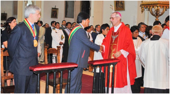 El presidente Evo Morales y el vicepresidente Álvaro García Linera, acompañados de ministros de Estado, asambleistas nacionales y departamentales, el gobernador Edmundo Novillo, el alcalde Edwin Castellanos y representantes gremiales, asistieron a la homilía celebrada en la Catedral Metropolitana por el Arzobispo de Cochabamba.
