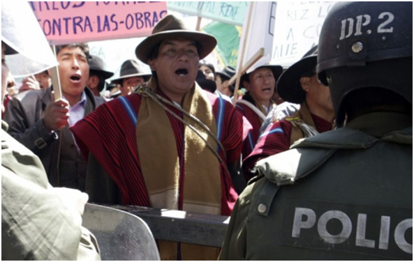 Los campesinos de esta región del altiplano de La Paz demandan la destitución de la ministra de Desarrollo Productivo, Teresa Morales y de la ministra de Desarrollo Rural, Nemecia Achacollo. La marcha llegó este martes a la tranca de San Roque, cercana a la ciudad de El Alto, luego de recorrer varios kilómetros en la vía que conecta a la sede de Gobierno con la región del lago Titicaca.