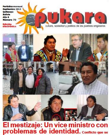 La edición 73 del periódico indianista Pukara, correspondiente al mes de septiembre, incluye como tema principal la nota «Otro dilema del gobierno: ¿mestizo o no mestizo?», donde el articulista Carlos Guillén dice que la descolonización no debe temerle al concepto del mestizaje.pukara73