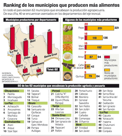 Santa Cruz y La Paz son las regiones que lideran la producción de alimentos agropecuarios. De los 62 municipios “campeones” en la producción de alimentos en todo el país, 30 se sitúan en los dos departamentos (15 en cada una de las regiones).