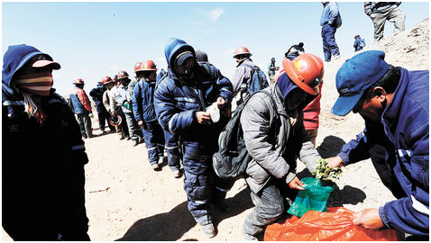 Vigilia. Un grupo de mineros asalariados de Colquiri se aprovisiona de hojas de coca para mantener sus medidas.