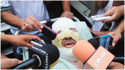 El periodista Fernando Vidal declara a los medios desde el centro de atención médica donde fue atendido por quemaduras en el 40% de su cuerpo.