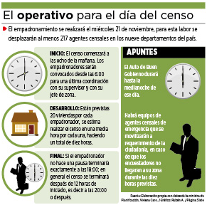 También informó que los efectivos de las Fuerzas Armadas serán alistados, como medida preventiva, para garantizar la cantidad de encuestadores. “Vamos a insistir esta semana para tener un buen número de empadronadores, pero si surgiera problemas, lo importante para la población es que (garantizamos que) habrá empadronadores”.
