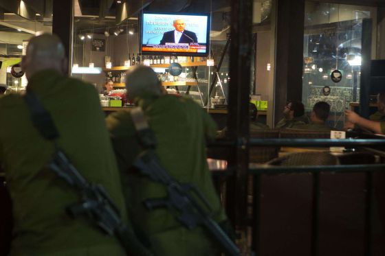 Soldados israelíes miran por televisión un discurso de Benjamin Netanyahu después del alto el fuego. / MENAHEM KAHANA (AFP)