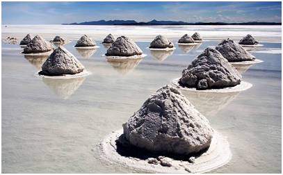 “Podría ser un cuadro de Dalí: un paisaje amplio de un blanco cegador, bajo un cielo azul intenso, salpicado por lagunas rojas y verdes, con flamencos rosas, volcanes extintos, fuentes termales, cáctus gigantes y géiseres activos. Es el Salar de Uyuni, sin duda uno de los paisajes más extraños e inquietantes del planeta. Está situado a 3.656 metros sobre el nivel del mar en el altiplano del suroeste de Bolivia, muy cerca de las cumbres andinas. El paisaje es tan insólito que llega a ser desagradable: desolado, y azotado por fuertes vientos. El Salar de Uyuni está considerado la zona cubierta de sal más extensa del mundo: de sus 10.000 millones de toneladas de cloruro sódico, se extraen unas 20.000 cada año.