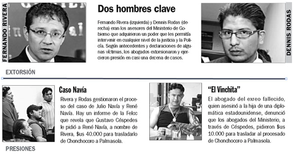 El Deber, La Paz.- Los ex asesores legales del Ministerio de Gobierno, Fernando Rivera y Dennis Rodas, trabajaron cinco años en esa repartición estatal, sortearon las gestiones ministeriales de Alfredo Rada, Sacha Llorenti, Wilfredo Chávez y Carlos Romero, y según la indagación y las denuncias de implicados en otros ocho casos, con el poder absoluto que les otorgaron, extorsionaron o dilataron procesos contra opositores, autoridades y hasta presuntos delincuentes.