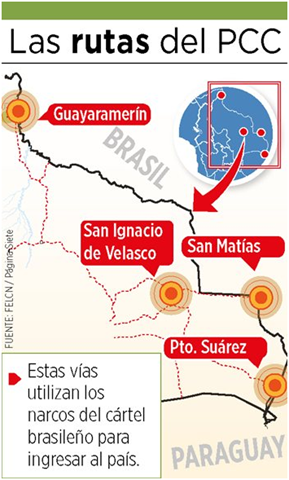 El director nacional de la Fuerza Especial de Lucha Contra el Narcotráfico (FELCN), Gonzalo Quezada, informó que la nueva vía a Puerto Suárez (Santa Cruz), la ruta San Ignacio-San Matías, también en Santa Cruz, que conecta con el estado de Mato Grosso en Brasil, y Guayaramerín (Beni)-Guajará Mirim (Brasil) son las tres rutas que utilizan los narcos del PCC.
