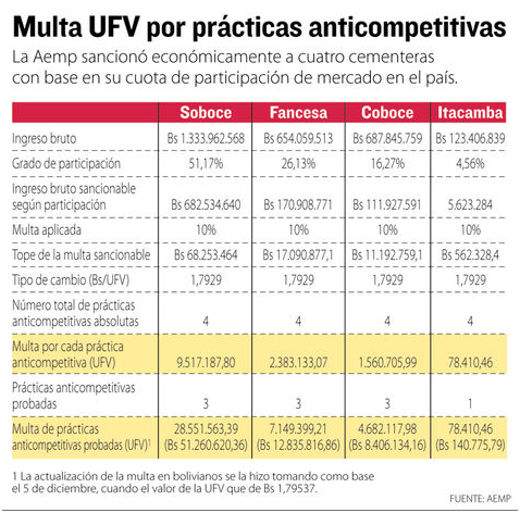 La multa impuesta por la entidad reguladora a las cuatro cementeras alcanza a 40,46 millones de UFV (Unidad de Fomento a la Vivienda) que equivalen a Bs 72,54 millones calculados el 23 de noviembre. Al tipo de cambio de hoy, miércoles, el monto ascendió a Bs 72,64 millones. Es decir que se incrementó en Bs 100 mil más por el tipo de cambio.