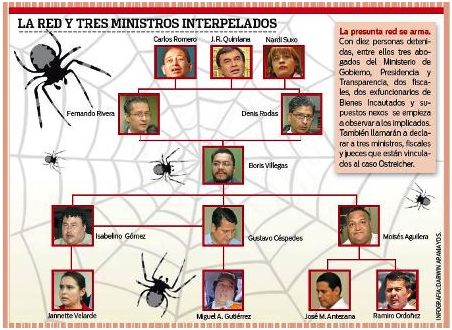 La denuncia fue hecha por el norteamericano Jacob Ostreicher, a quien exigieron 50 mil dólares para su liberación; está acusado del delito de legitimación de ganancias ilícitas. El Ejecutivo apuntó a Fernando Rivera Tardío, Denis Rodas Limachi, Boris Villegas y José Antezana Pinaya como los cabecillas de la red de extorsión, ya que ellos trabajaron en los ministerios de la Presidencia y Gobierno.