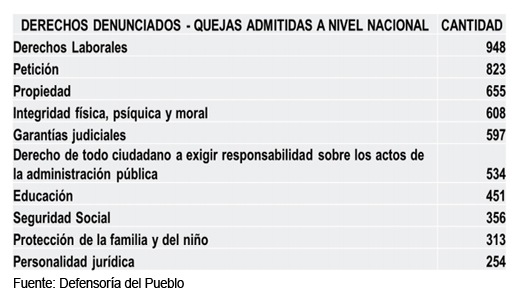 “En lo que va de la gestión, hasta noviembre de 2012, (la Defensoría del Pueblo) ha recibido por 948 casos que el derecho más vulnerado son los derechos laborales, es decir lo que viene a ser falta de pago de salario generalmente en las instituciones del Estado, principalmente”, señaló el funcionario en declaraciones a Erbol.