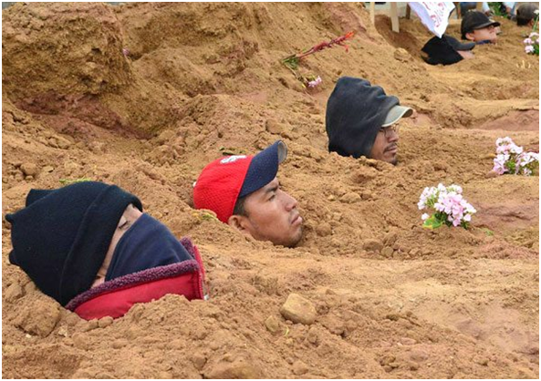 Con la tierra al cuello y carteles escritos con sangre, los reos exigen