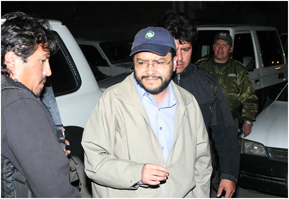 El fiscal Fernando Cabrera, miembro de la comisión de fiscales asignados al caso, informó que el exdirector formó parte de la red delictiva y que organizaba operativos policiales. Señaló que tenía relación directa con los acusados y encarcelados Fernando Rivera y Dennis Rodas, asesores del Ministerio de Gobierno.