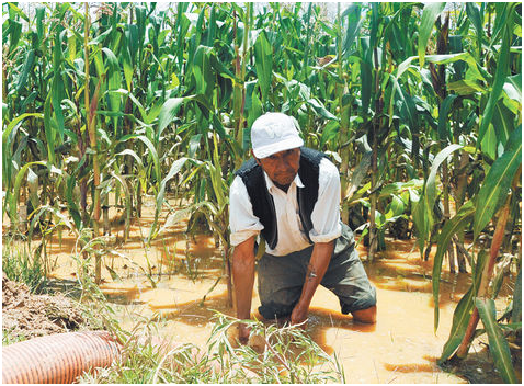 Cochabamba. Un agricultor de Cliza trata de evacuar el agua del campo de maíz. Sucedió en enero. Fernando Cartagena.