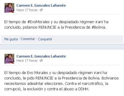 Desde su cuenta en Facebook, la legisladora pandina dice: “El tiempo de #EvoMorales y su despiadado régimen iraní ha concluido, pidamos RENUNCIE a la Presidencia de #Bolivia”.
