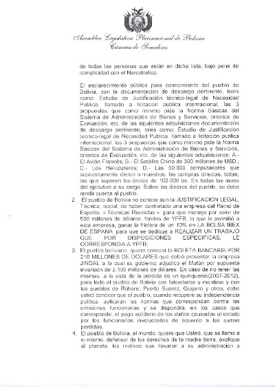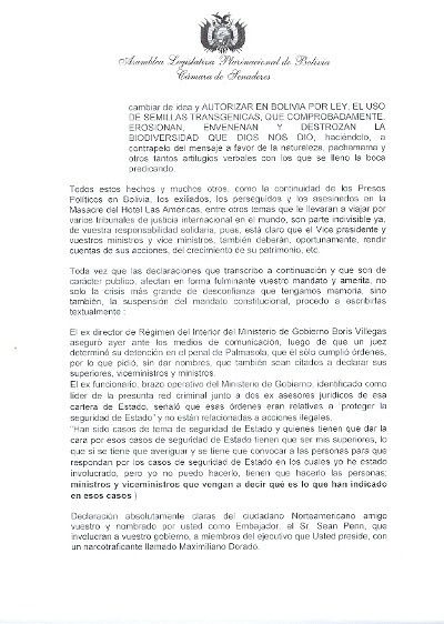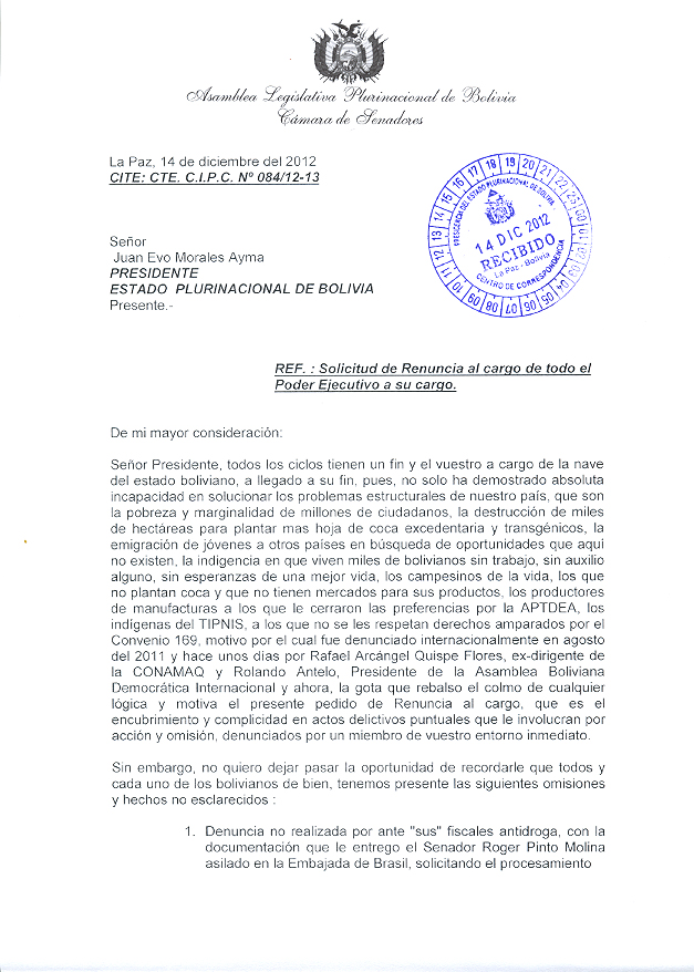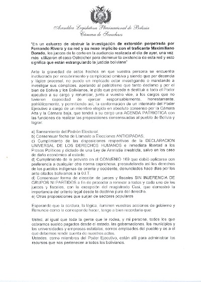 La senadora opositora Carmen Gonzales Lafuente (CN) envió el día de ayer una nota oficial a la Presidencia del Estado Plurinacional, pidiendo la renuncia de Evo Morales a su cargo de presidente por “encubrimiento y complicidad” en los casos de corrupción recientemente descubiertos.
