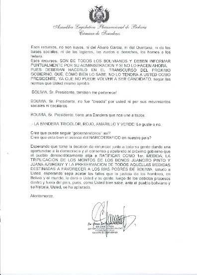 En la nota oficial se incluye la demanda de un adelantamiento de las elecciones nacionales y se indica al presidente Morales que “su ciclo a cargo de la nave del Estado boliviano ha llegado a su fin”.