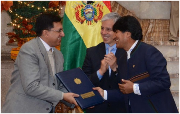 Timoteo Sánchez, presidente de la Asociación de Universidades Privadas junto al presidente Evo Morales y el vicepresidente Álvaro García Linera/ Foto Palacio de Gobierno