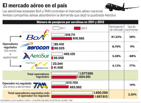 En la gestión 2012, las aerolíneas estatales BoA y TAM tomaron el control del mercado aéreo del transporte de pasajeros tras la quiebra de AeroSur. Ambas compañías controlan actualmente el 90% de la demanda nacional. Según datos combinados de la Dirección General de Aeronáutica Civil (DGAC) y de Transporte Aéreo Militar (TAM), ambas compañías —y en menor medida Amaszonas— absorbieron la demanda de pasajeros que dejó la desaparecida AeroSur, que terminó de operar el 17 de mayo de 2012.