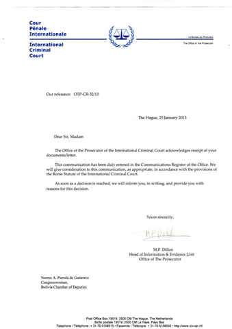 La oficina del Fiscal confirmó la interposición de esa denuncia, si bien aclaró que la introducción no implica su admisión a trámite que se decidirá teniendo en cuenta lo establecido en el Estatuto de Roma.