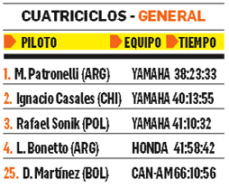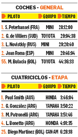 Marco Patronelli sigue mandando en la general en cuatriciclos mientras que el boliviano Diego Martínez se ubica en el penúltimo puesto. En coches, la organización decidió suspender la carrera por el mal clima.