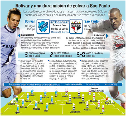 Bolívar tendrá seguramente menos preocupaciones defensivas dada la postura habitual de los visitantes de tierras bajas, de cuidarse mucho por su visita a la altura, un enemigo a veces más temible que los 11 de enfrente que lucen la camiseta rival. Además, Sao Paulo aprovechará esta su visita para probarse para cuando tenga que volver en los grupos para rivalizar con el Tigre de Achumani.