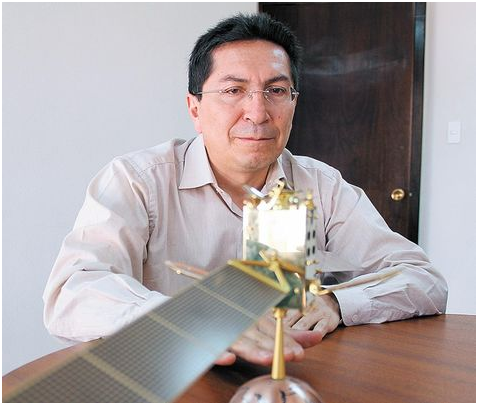 Entrevista. El ingeniero Iván Zambrana en su oficina junto a una réplica del satélite Túpac Katari. Foto: Eduardo Schwartzberg.