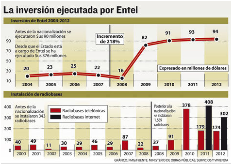“En la época de la capitalización, Entel ha hecho una inversión de $us 90 millones desde 2004 hasta 2007. Después del proceso de nacionalización, la inversión se incrementó significativamente y alcanzó los $us 376 millones”, detalló el ministro.