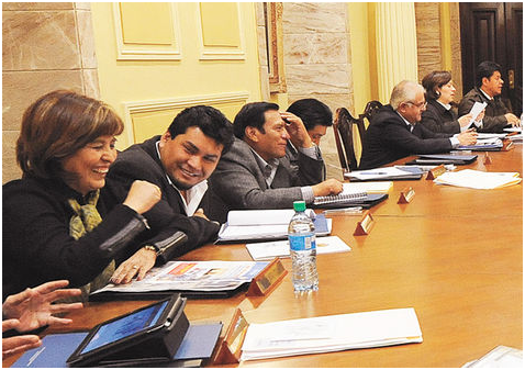 Coordinación. Nardi Suxo (izq.), en una reunión de gabinete en el Palacio de Gobierno. Archivo.
