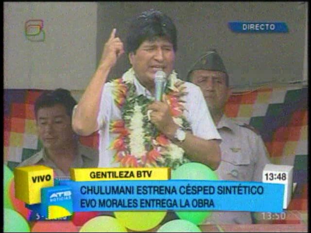 Chulumani. La Paz.- El presidente del Estado, Evo Morales, este sábado ha entregado un campo deportivo en Chulumani, en los Yungas de La Paz. En oportunidad de dirigirse a la concentración se refirió a varios de la coyuntura política nacional.
