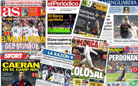 Ya en España, desde el "Perdonan" o el "Caerán en el Camp Nou" de la prensa catalana, que recoge el sentimiento de oportunidad perdida en el Santiago Bernabéu a pesar del buen juego, a la visión más escorada hacia el conjunto madridista de la prensa capitalina. "El mejor fútbol del mundo. Un Varane imperial equilibró el gol de Cesc", titula ‘As’. Y ‘Marca’ se centra en el madridista Varane para catalogar el partido y su actuación como "Colosal". Y dice del defensa galo que "evita tres goles cantados y marca el empate en su primer clásico". En general, casi todos coinciden que en esta ocasión Cristiano y Messi tuvieron menos protagonismo al no ser los autores de los goles de sus respectivos equipo y no poder desequilibrar la contienda.