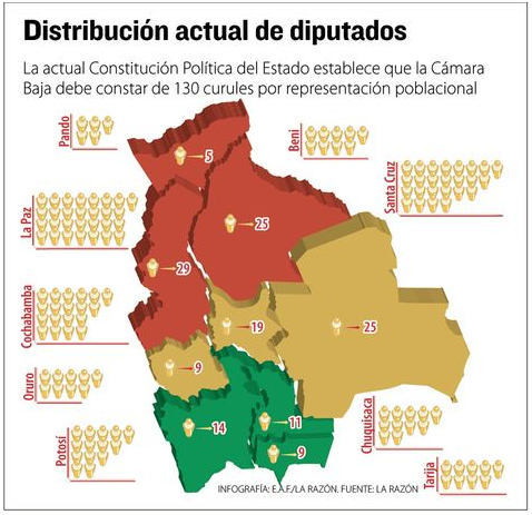 El Artículo 146, numeral V, de la Carta Magna dice: “La distribución del total de escaños entre los departamentos se determinará por el Órgano Electoral en base al número de habitantes de cada uno de ellos, de acuerdo al último censo nacional, de acuerdo a la Ley”.Elecciones. Marcelo Antezana y Javier Leigue, asambleístas opositores de Convergencia Nacional (CN), coincidieron en señalar que la redistribución debe realizarse antes de los comicios generales del siguiente año. “Lo contrario será tener relegadas a las regiones durante 15 años. Ya en el último reacomodo Santa Cruz debía tener un diputado más, pero lo cedió a Pando”, comentó Antezana.