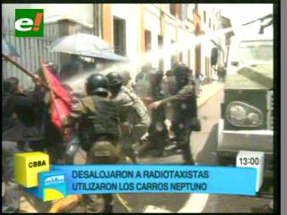 La Policía de Cercado recurrió a los dos carros antimotines (Neptunos) y dispersó con agua la concentración de afiliados de la Asociación de Radiomóviles de Cochabamba (Aramco), que cumplen una paro indefinido contra la Ordenanza municipal 4394, que regula el ingreso de vehículos en el centro de laciudad.