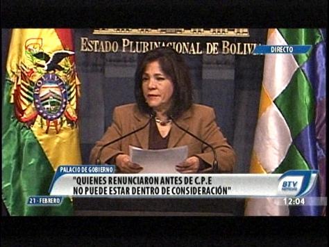 “Los únicos acuerdos que ha firmado el gobierno han sido los que están ya incorporados en la Constitución Política del Estado. En ningún momento, absolutamente en ninguna reunión, en ninguna instancia el presidente Evo Morales ha renunciado a su derecho de postularse a una reelección, en ningún momento ha firmado un documento, en ningún momento ha conversado y acordado con ningún sector de la oposición esta renuncia a un a derecho constitucional que tiene el presidente Evo Morales como cualquier otro ciudadano” indicaba la Ministra Amanda Dávila.