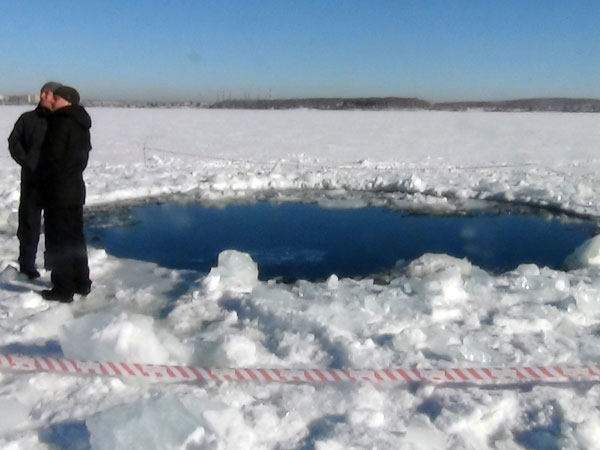 Los fragmentos cayeron en el agua a pocos kilómetros de una unidad militar en Chebarkul. El Ministerio de Emergencia fue notificado por un pescador local, que avisó que una enorme polinia de 8 metros de diámetro podía ser el sitio de impacto.