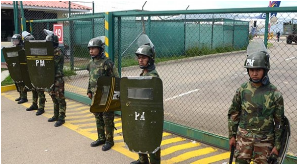 Cochabamba. Un grupo de policías militares custodia el aeropuerto internacional Jorge Wilstermann, después de que fuera nacionalizado por el Gobierno de Evo Morales. En el país fueron expropiadas las terminales aéreas de Cochabamba, Santa Cruz y El Alto. Foto Los Tiempos