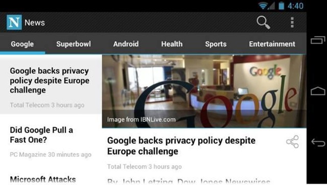Esta aplicación nos permite gestionar nuestras fuentes de noticias de Google Noticias desde una interfaz visualmente bien resuelta que aprovecha el tema Holo y que ofrece una serie de pestañas para navegar por las distintas secciones de la aplicación.