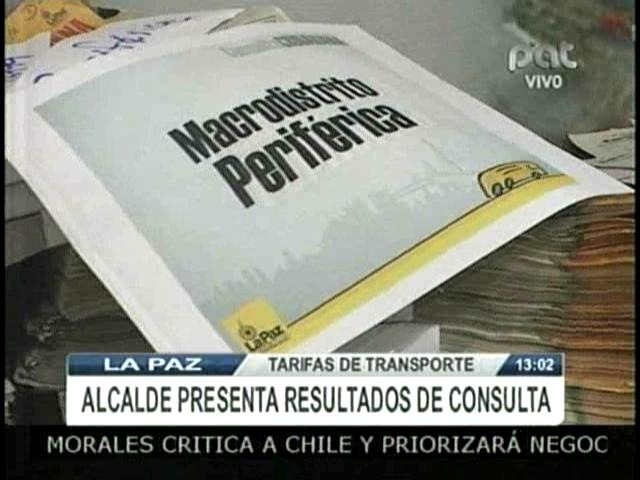 “Hasta el día de hoy hemos podido tabular 120 mil de las boletas que corresponde al 73 por ciento del conjunto del universo de las boletas que han sido llenadas.  Los resultados de las boletas arrojan en el caso de la primera pregunta un resultado de 80 por ciento a favor de la propuesta del Gobierno Municipal, que se refiere a la tarifa única para los distintos modos o modalidades del transporte”, indicó la autoridad. (Fides)