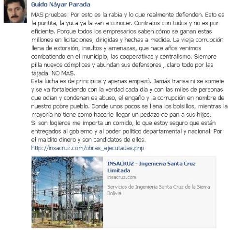 El mensaje del ex vicepresidente cívico incluye un link hacia la web de la empresa Insacruz, de la cual Guillermo Schrupp es gerente general, donde se muestra una lista de contratos con la CRE y la Gobernación cruceña.