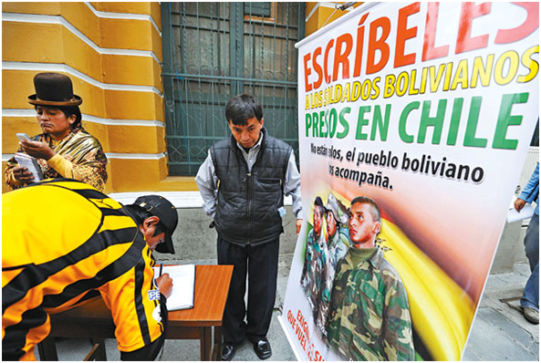 Entretanto, Morales declaró a los tres dragoneantes "grandes defensores del mar" porque a raíz de que Bolivia reclama a Chile una salida soberana al océano Pacífico en ese país “quieren vengarse con nuestros soldados”. El acto de ayer fue considerado por el mismo presidente de repudio a la invasión de tropas chilenas a Antofagasta en 1879. En diferentes ciudades de Bolivia se realizaron eventos similares