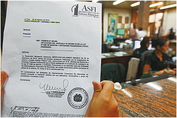 La circular 1082/2013 que la Autoridad de Supervisión del Sistema Financiero (ASFI) les hizo llegar a las cooperativas del país es un ‘tirón de orejas’ a las mismas por no respetar una norma que está vigente y que establece que las entidades de intermediación financiera no bancaria no pueden conceder, ni mantener créditos con sus ejecutivos, funcionarios o grupos prestatarios vinculados.