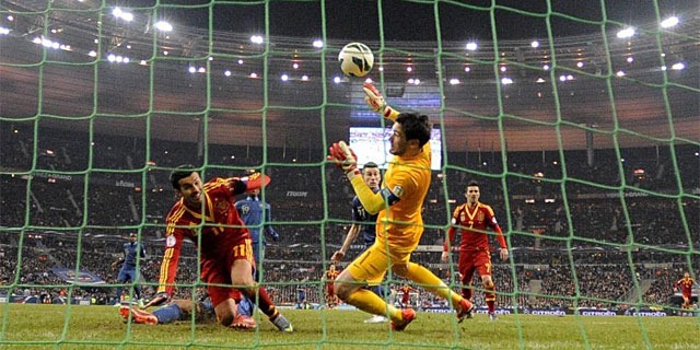Si alguien desentonó fue el árbitro, mal en lo técnico, peor en lo disciplinario. Mejor obviar sin embargo dos patadas de Matuidi y Jallet, liberadas de milagro del castigo de la amarilla. O el penalti de Lloris sobre Pedro, arrollado sin contemplaciones cuando ya se inclinaba para la caída o el engaño. Mejor quedarse con ese fútbol arrebatado, propio de las grandes noches. Como si más que de una clasificación se tratara de una finalísima. Nada sencillo para España, exigida en cada pulso, metro a metro. No queda otra solución ante Xavi y Alonso, los mejores fogoneros de la máquina roja. Quién diría que arrastraban molestias. Más bien, lo que traían consigo era el manual de instrucciones. Para mover al equipo, para buscar el pase interior y el desborde, bien hacia el desmarque de Pedro o al apoyo de Villa. O para alguna incorporación de su lateral zurdo, en este caso Monreal.