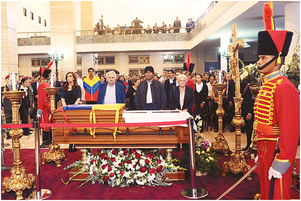 Cristina Fernández, José Mujica y Evo Morales ante el féretro de Hugo Chávez.