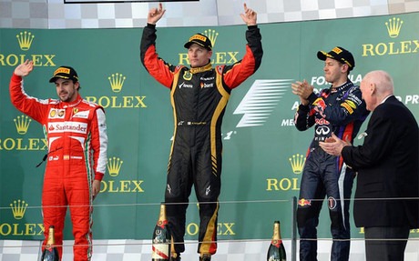 La clave de la carrera para Fernando Alonso ha estado en la segunda parada, en la vuelta 21, ya que taponado por el tráfico detrás de Vettel y Massa ha adelantado su entrada en boxes y ha aprovechado la maniobra para adelantarles a ambos. Con el Red Bull con serios problemas de degradación de neumáticos, ha sido desde entonces una pelea contrarreloj contra Raikkonen, mientras que Adrian Sutil (Force India) y Lewis Hamilton se han intercalado en las primeras posiciones para darle brillantez a una prueba que ha respondido a las expectativas. Kimi Raikkonen, que lleva dieciocho carreras consecutivas puntuando, cuya última victoria fue en Abu Dhabi el año pasado, ha terminado por delante de Alonso y Vettel, en un podio en el que todos estaban contentos y con el enfado de Felipe Massa, quien consideró que Ferrari había beneficiado a Fernando en la estrategia y por ello había perdido dos posiciones. Si la cara de la carrera fue el Lotus, la cruz era el McLaren, extremadamente lejos y fuera de nivel, con Jenson Button solo pudiendo ser noveno y Sergio Pérez fuera de los puntos.
