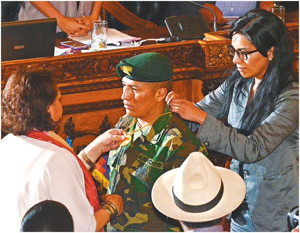 La diputada Betty Tejada coloca una medalla a uno de los tres soldados que estuvieron presos en Chile. Foto: APG noticias.