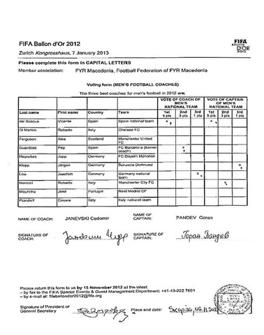 Tras las acusaciones de José Mourinho a la FIFA de irregularidades en la elección de Del Bosque como mejor entrenador de 2012, la FIFA ha publicado en su página web el voto de Goran Pandev enviado por la Federación de Macedonia de Fútbol al organismo mundial por fax.